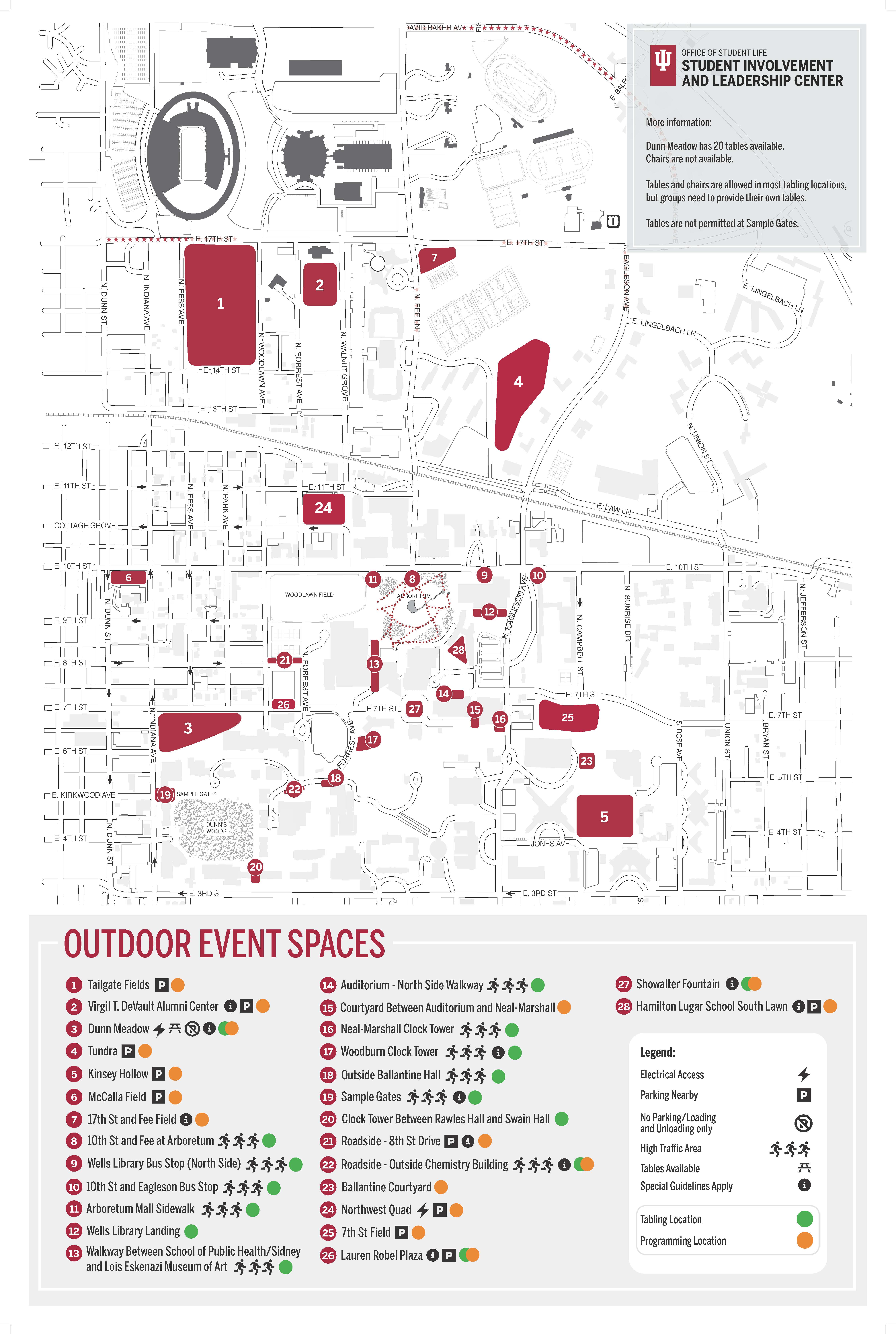• For outdoor spaces and certain classrooms, reply to the confirmation email or contact the Student Involvement and Leadership Center at spaceres@iu.edu.